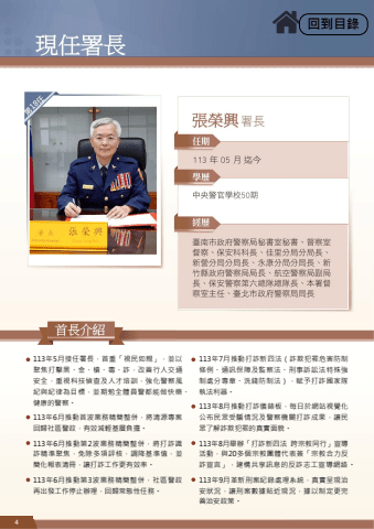 113年5月接任署長,首重「視民如親」,並以聚焦打擊黑、金、槍、毒、詐,改善行人交通安全,重視科技偵查及人才培訓,強化警察風紀與紀律為目標,並期勉全體員警都能做快樂、健康的警察。113年6月推動首波業務精簡整併,將清源專案回歸社區警政,有效減輕基層負擔。113年6月推動第2波業務精簡整併,將打詐識詐精準聚焦,免除多項評核,調降基準值,並簡化報表清冊,讓打詐工作更有效率。113年6月推動第3波業務精簡整併,社區警政再出發工作停止辦理,回歸常態性任務。113年7月推動打詐新四法(詐欺犯罪危害防制條例、通訊保障及監察法、刑事訴訟法特殊強制處分專章、洗錢防制法),賦予打詐國家隊執法利器。113年8月推動打詐儀錶板,每日於網站視覺化公布民眾受騙情況及警察機關打詐成果,讓民眾了解詐欺犯罪的真實面貌。113年8月舉辦「打詐新四法 跨宗教同行」宣導活動,與20多個宗教團體代表簽「宗教合力反詐宣言」,建構共享訊息的反詐志工宣導網絡。113年9月革新刑案紀錄處理系統,真實呈現治安狀況,讓刑案數據貼近現況,據以制定更完善治安政策。4回到目錄